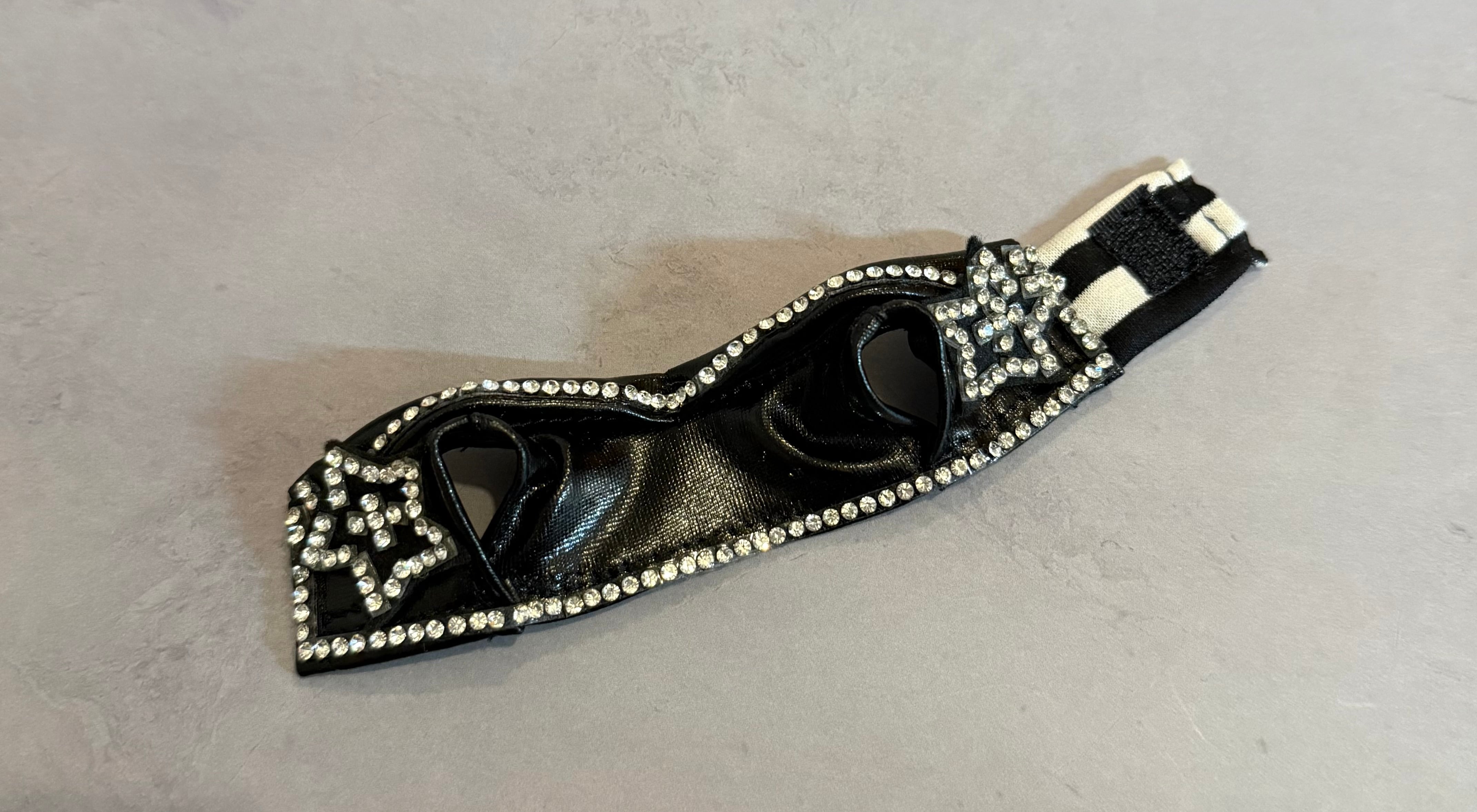 •ストレッチエナメルレザー風生地使用。インナーにボーダーTシャツ、粘着力の強いキラキラストーン使用。(強くこすると取れてしまう事もあるので、優しくお取り扱い下さい。)マジックテープで、着脱しやすくなっています。