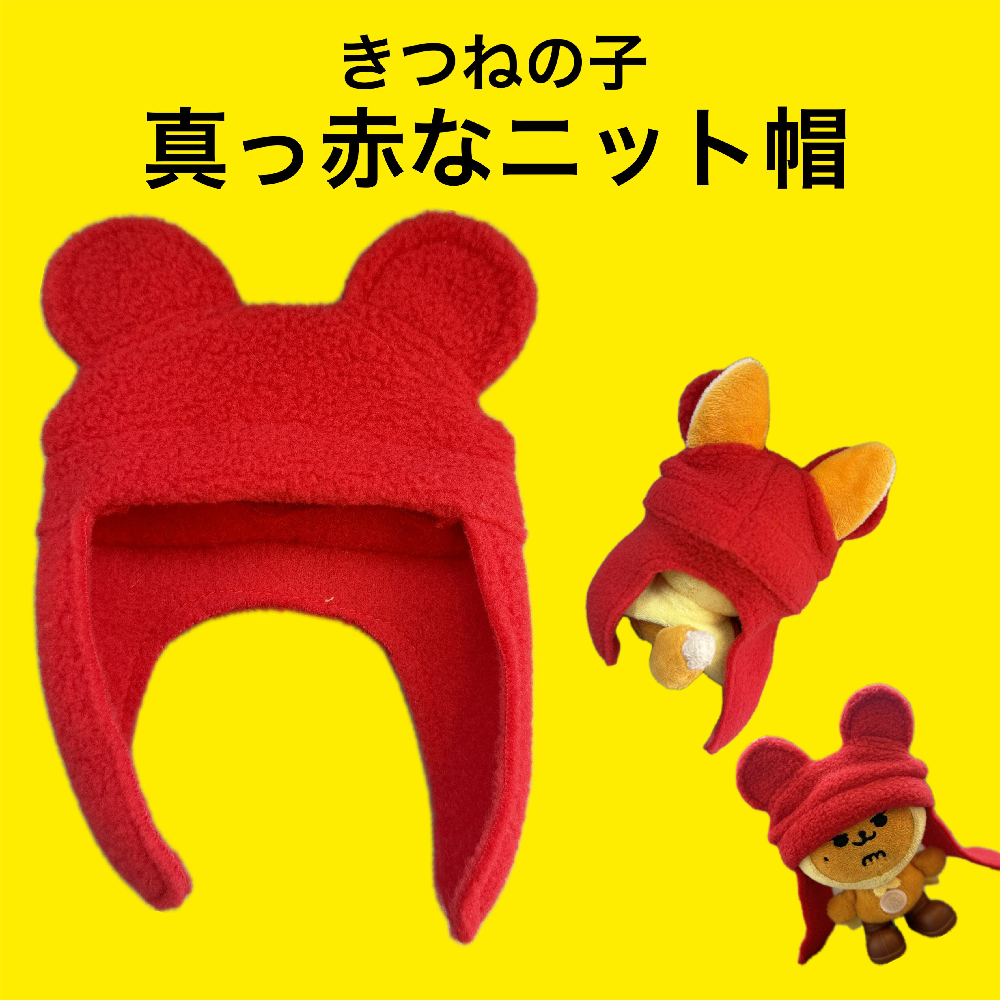 即発送 きつねの子 お座りきつねの子 真っ赤なニット帽 ファンメイド